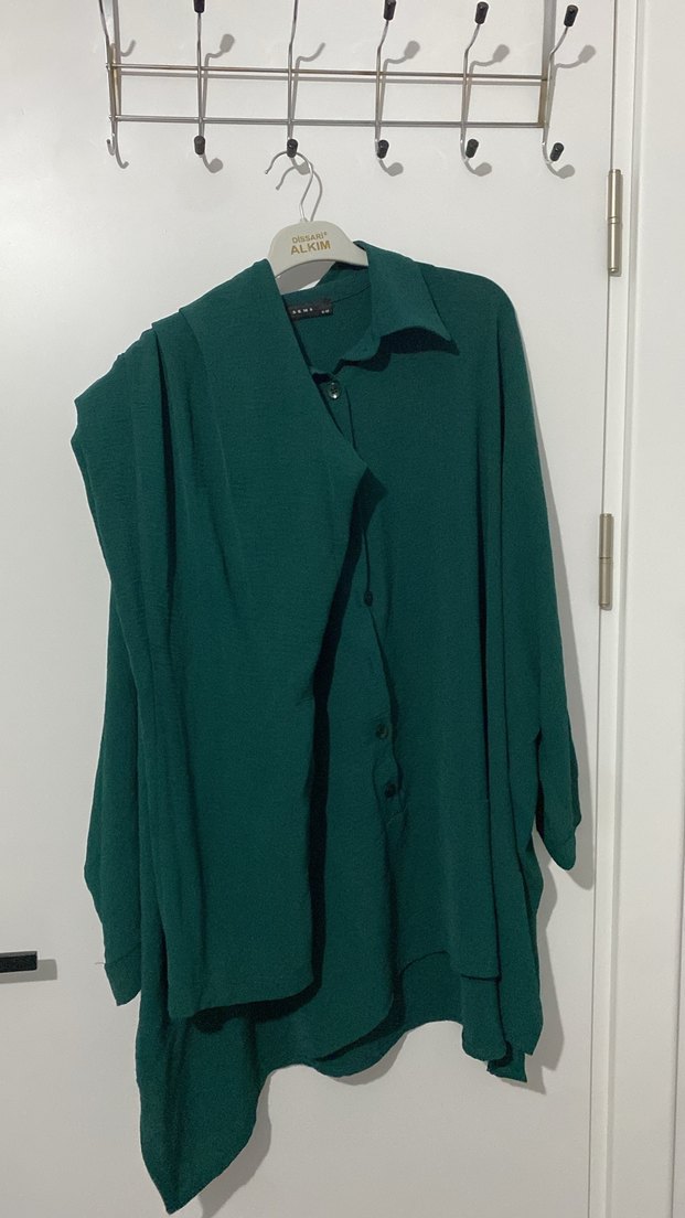 Kadınlar için koyu yeşil keten kumaştan, uzun kollu ve yakalı, düğmeli, bol kesim uzun gömlek. Günlük sokak stili için uygundur. Takim