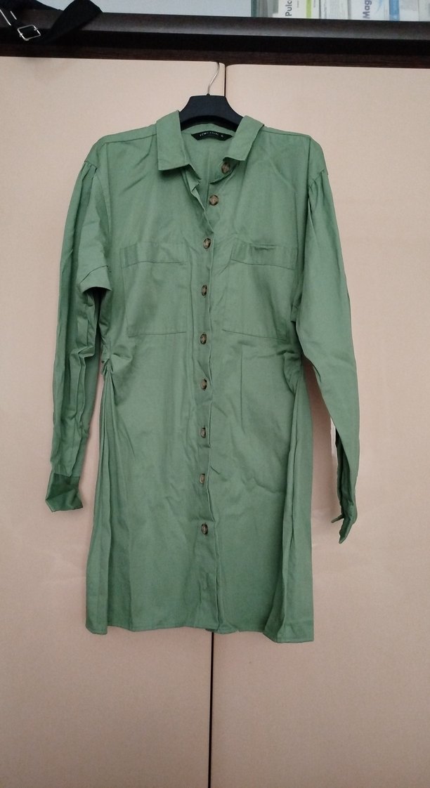 Nefes alabilir keten kumaştan yapılmış, pastel haki renkte, uzun kollu, düğmeli ve notlu yakalı bol kesim gömlek. Günlük sokak stiline uygun. boy 87 cm en en 45 cm