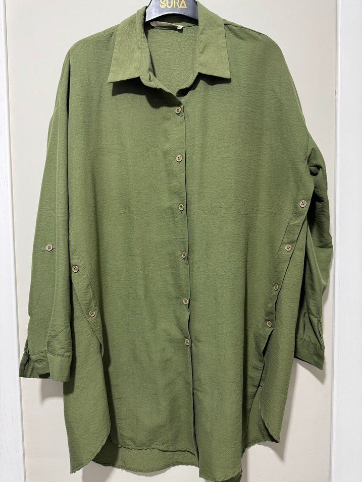 Kadınlar için bol kesim, uzun kollu ve düğmeli ön kısmı olan gömlek. Notlu yakalı ve uzun boylu, günlük sokak stiline uygun haki renkte.