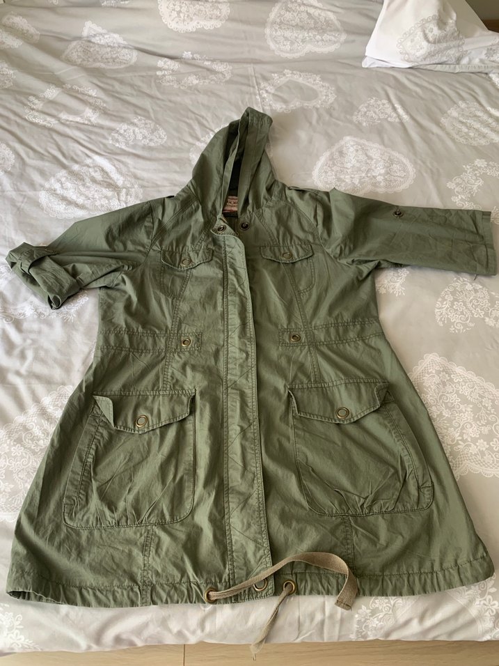 Keten kumaştan yapılmış, bol kesim haki renkli uzun kollu ve düğmeli ceket. Notlu yakalı ve parlak görünümlü, dış mekan kullanımı için uygun.