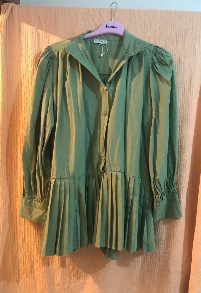 Keten kumaştan, bol kesim, uzun kollu haki gömlek. Pilili detaylar ve yüksek yakasıyla vintage bohem tarzda. Hiç gıtılmedi