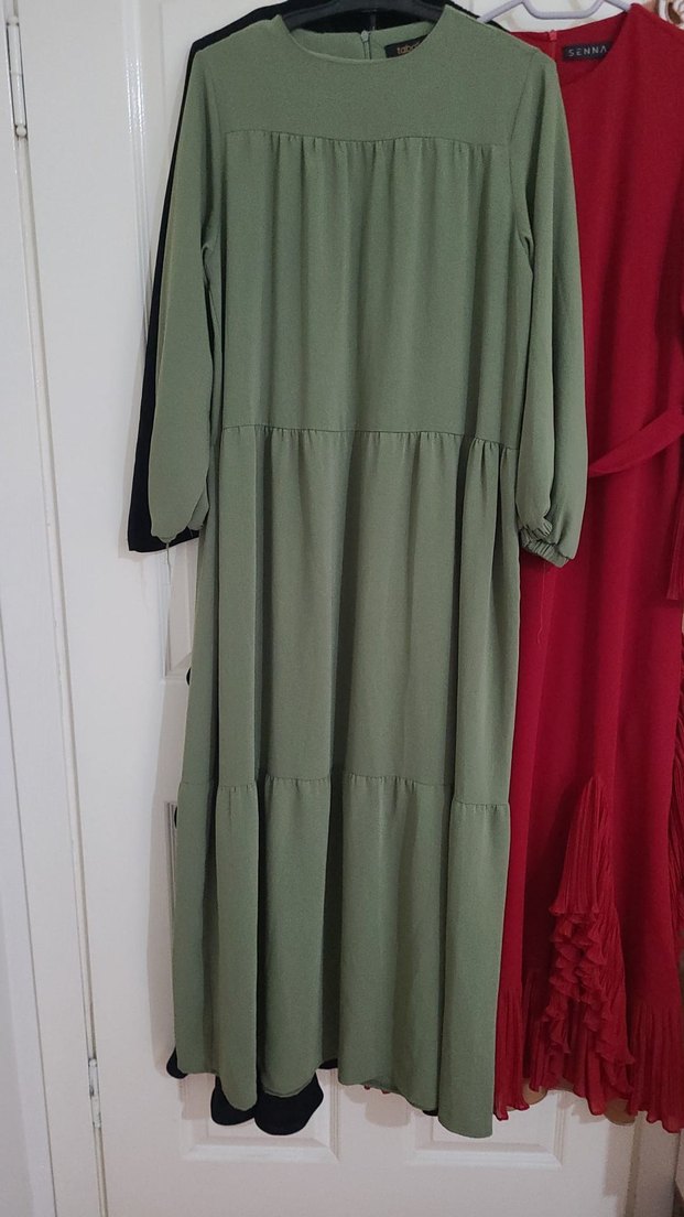 Haki renkli uzun kollu, tek renkli ve piliseli kesime sahip bol kesim elbisesi, günlük kullanıma uygundur.