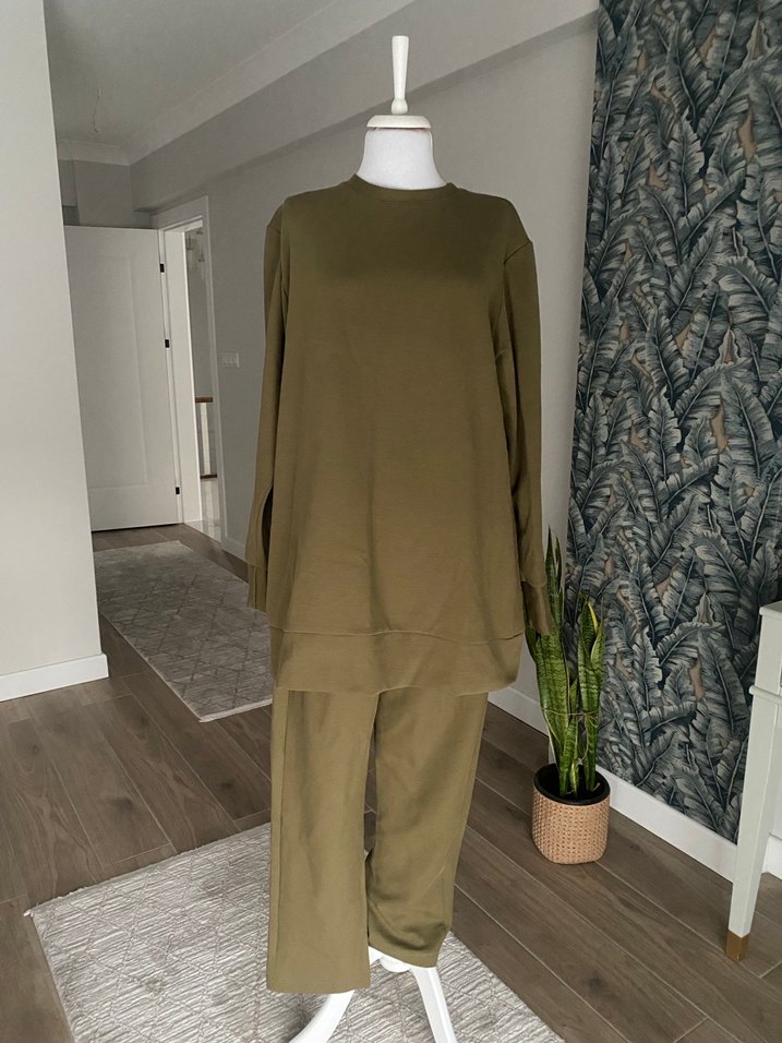 Kadınlar için haki renk, uzun kollu, yuvarlak yakalı, rahat kesim uzun eşofman takımı. Günlük kullanıma uygun, kolay şıklık sunar.