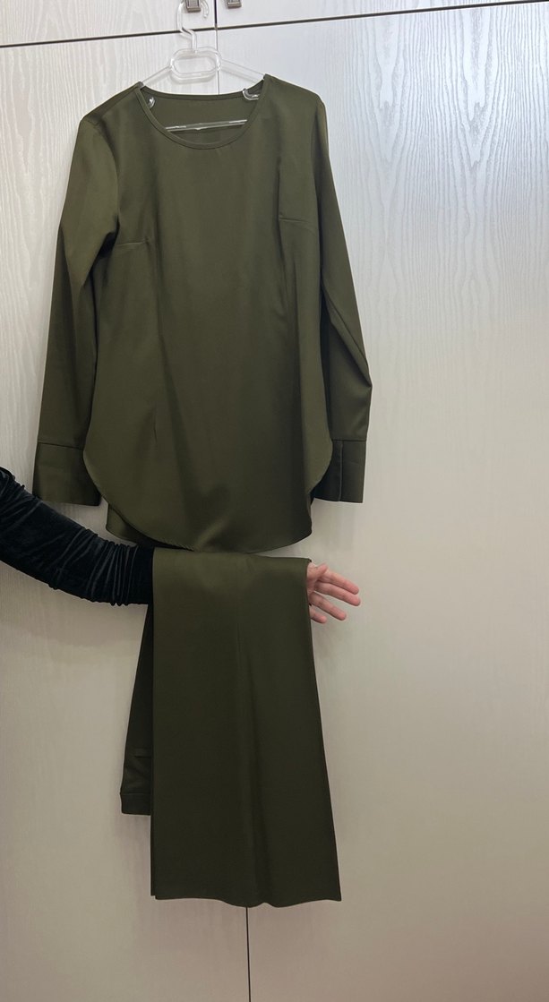 Kadınlar için uzun kollu, regular fit ve yuvarlak yakalı takım. Düz, koyu haki renkte, sentetik kumaştan ve drapeli tasarıma sahip.