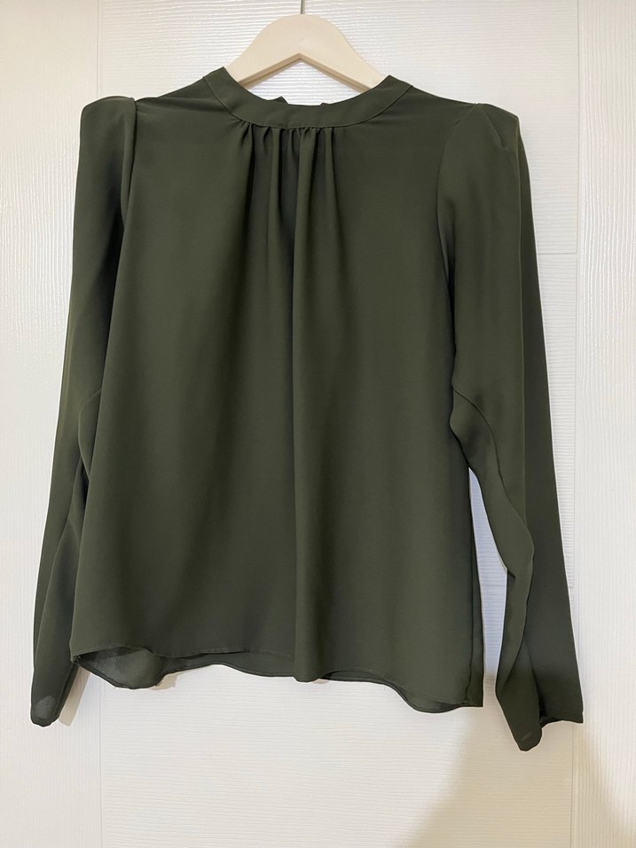 Uzun kollu, yuvarlak yakalı, salaş kesim ve drapeli tasarıma sahip haki renk kadın bluz. Ofis için uygun, ipeksi dokulu ve sade şık