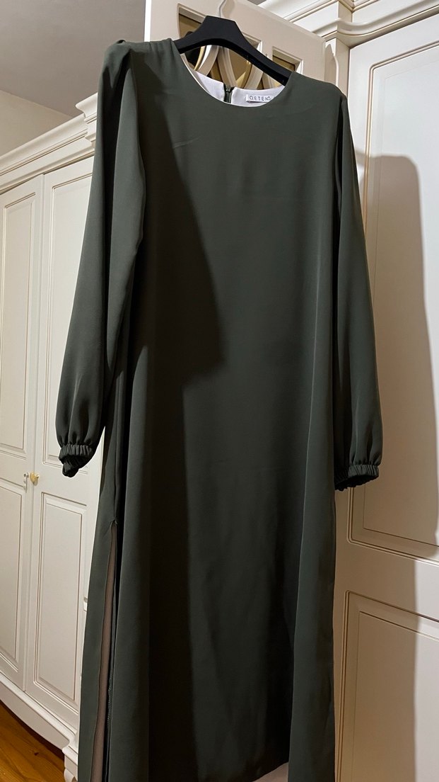 Kadınlar için haki renkte, uzun kollu, yüksek yakalı, salaş kesim ve dökümlü uzun elbise. Ofis kullanımı için uygun, minimalist ve desen içermeyen model.