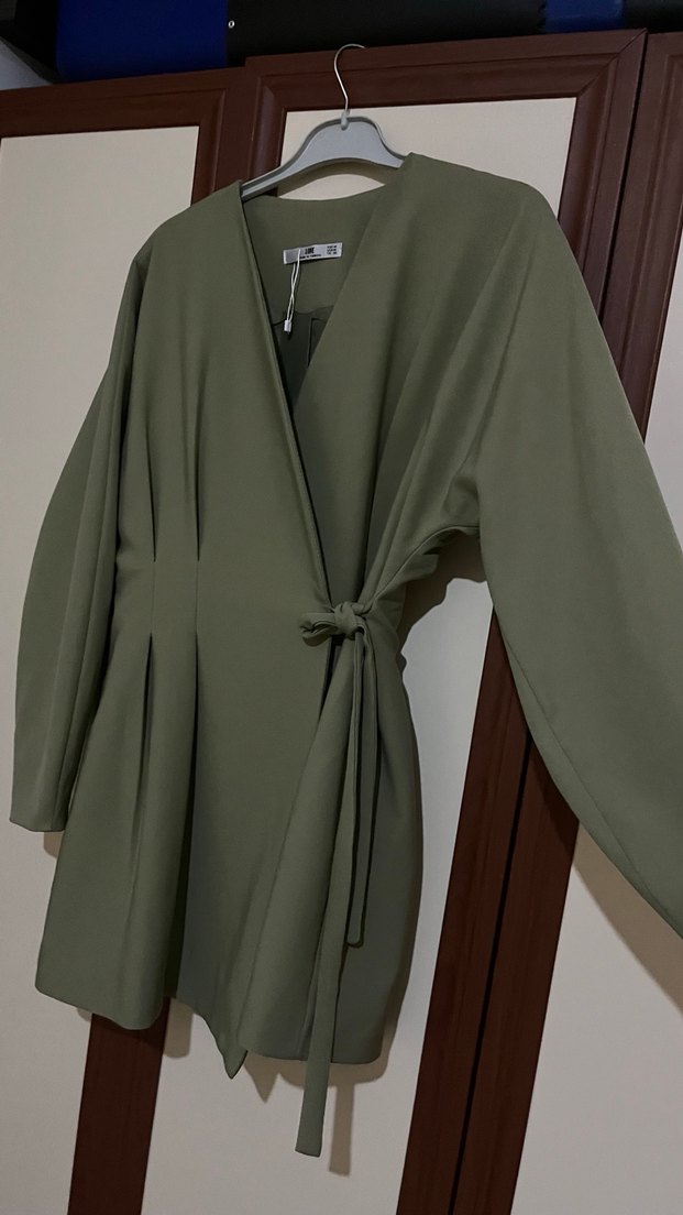 Kadınlar için haki renkte, uzun kollu ve salaş kesim minimalist sabahlık. Bağcıklı ve desensiz sade tasarıma sahiptir. Sadece bir kere giyildi