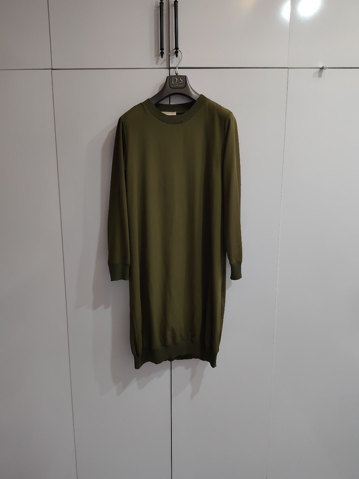 Kadın haki renk, yuvarlak yaka, uzun kollu, salaş kesim uzun tunik. Düz ve minimal tasarımıyla günlük kullanıma uygundur.