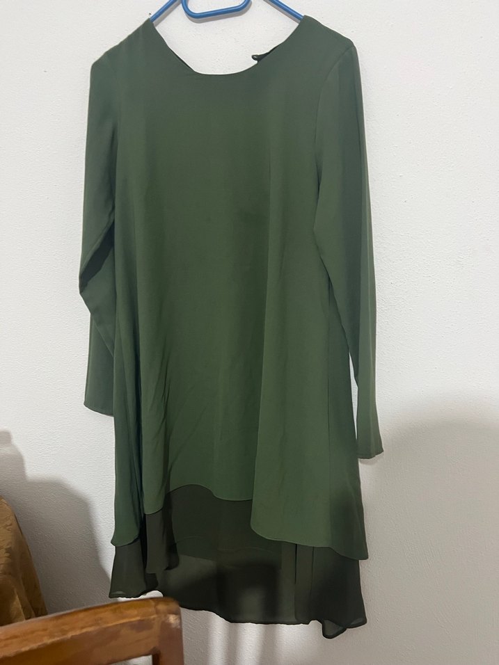 Kadın tunik, uzun kollu ve salaş kesimdir. Haki renkte, drapeli uzun boy ve sentetik kumaştan yapılmıştır. Minimalist ve sade tarz için uygundur. İkili takım