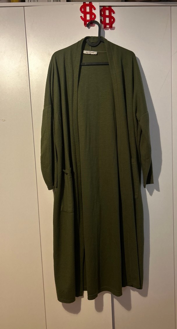 Uzunluğu 1.20cm Bu kadın hırka, salaş kesim ve uzun kollu olup koyu haki renktedir. Normcore tarzında, desensiz ve rahat bir görünüme sahiptir.