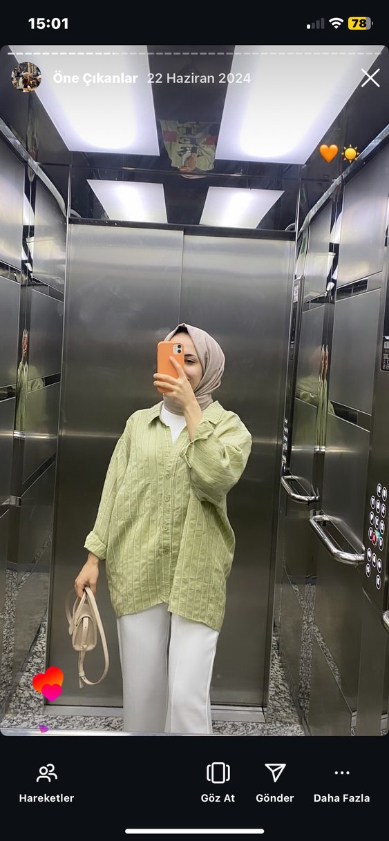 Keten kumaştan, hafif tie-dye desenli, uzun kollu, yüksek yakalı, transparan dokulu, midi boydaki bol kesim haki gömlek. Bir kez giyildi