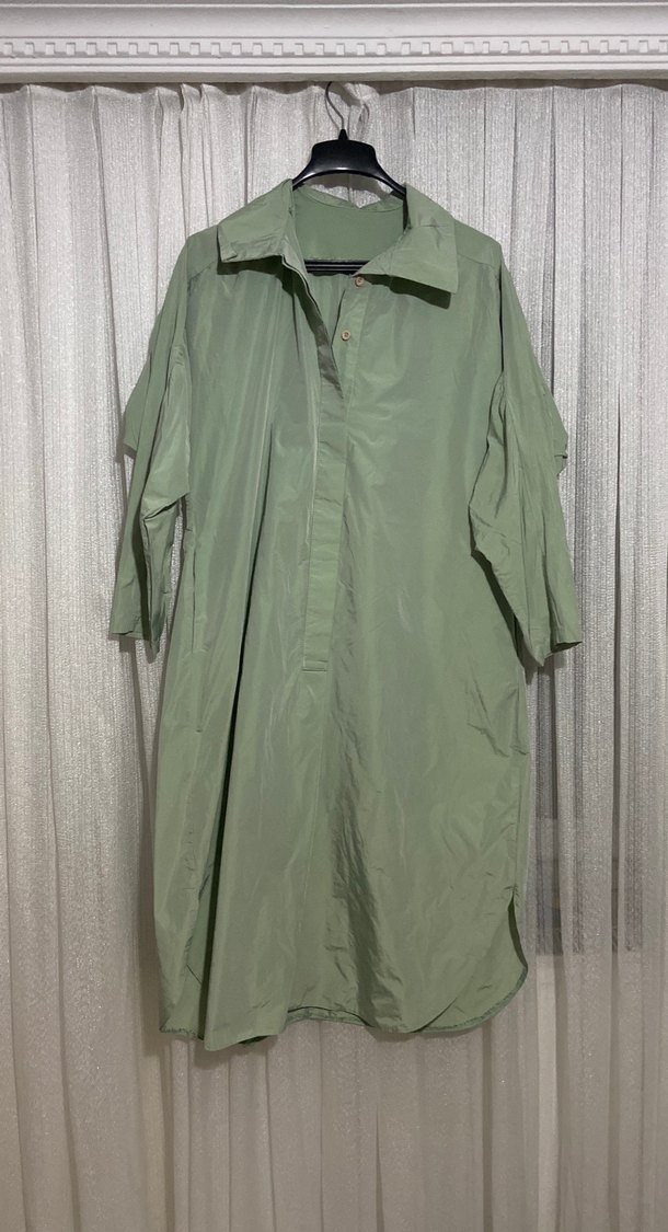 Sentetik kumaştan üretilmiş, bol kesim, uzun kollu haki yağmurluk. Yaka detaylı ve salaş duruşlu, günlük rahat kullanım için uygundur. ☔