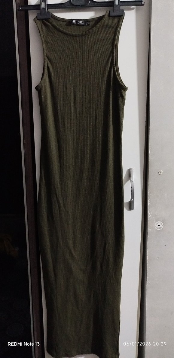 Kolsuz, yüksek yakalı, vücuda oturan haki uzun elbise, yumuşak sentetik kumaştan, desensiz ve minimalist tarzda günlük kullanım için uygun.