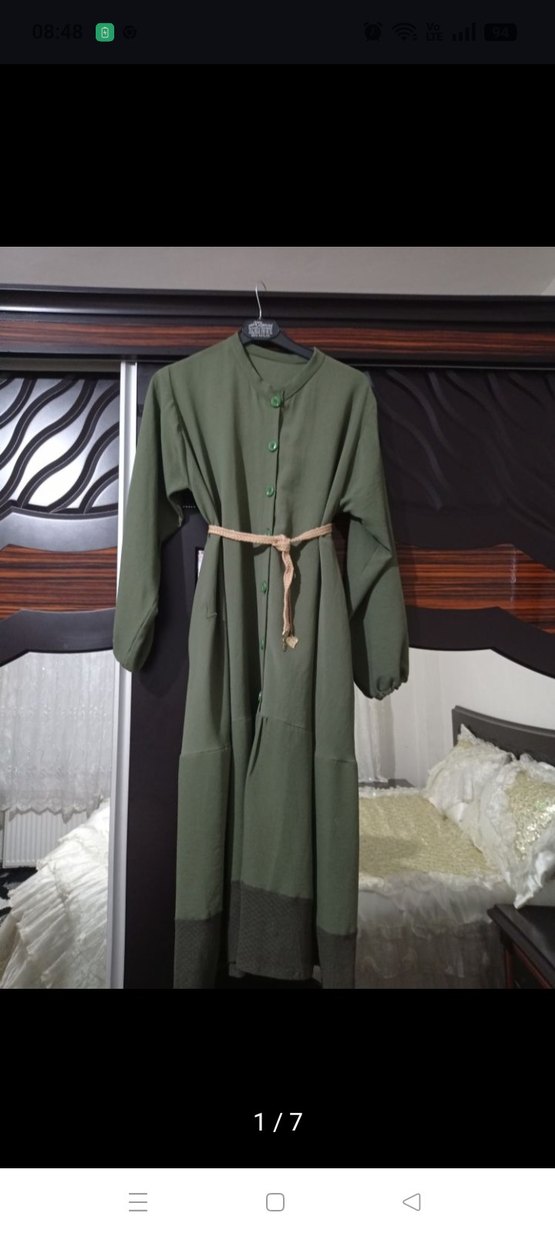 Haki renkte, krep kumaştan yapılmış, uzun kollu, yakalı ve yeşil kemerli, düzenli kesim kadın Tunik kadın ceblerı de var