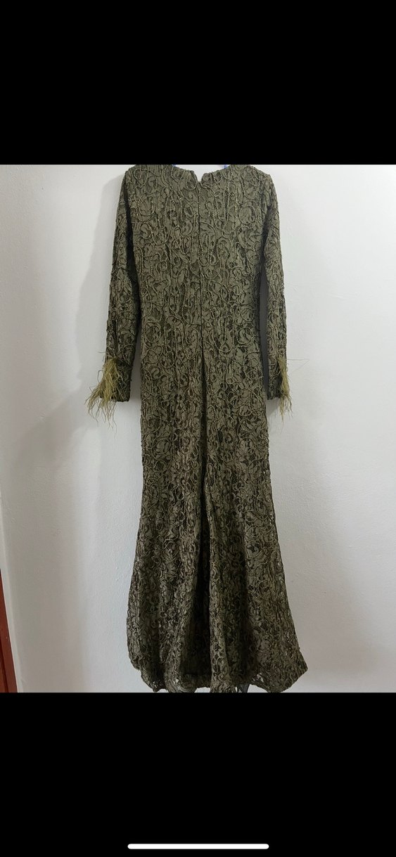 Fitted kesim, uzun kollu ve kayık yaka olan bu uzun abiye elbise, kürk detayları ve desenli kumaşıyla haki renkte avant-garde ve bohem tarzlara uygundur.