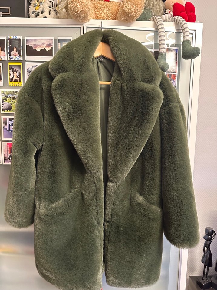 Zara Kadın haki renkli, uzun kollu, normal boyda peluş kaban. Notched lapel yakası ve bol kesimiyle rahat ve sıcak bir kullanım sunar. Desensiz ve sade tasarımlıdır.