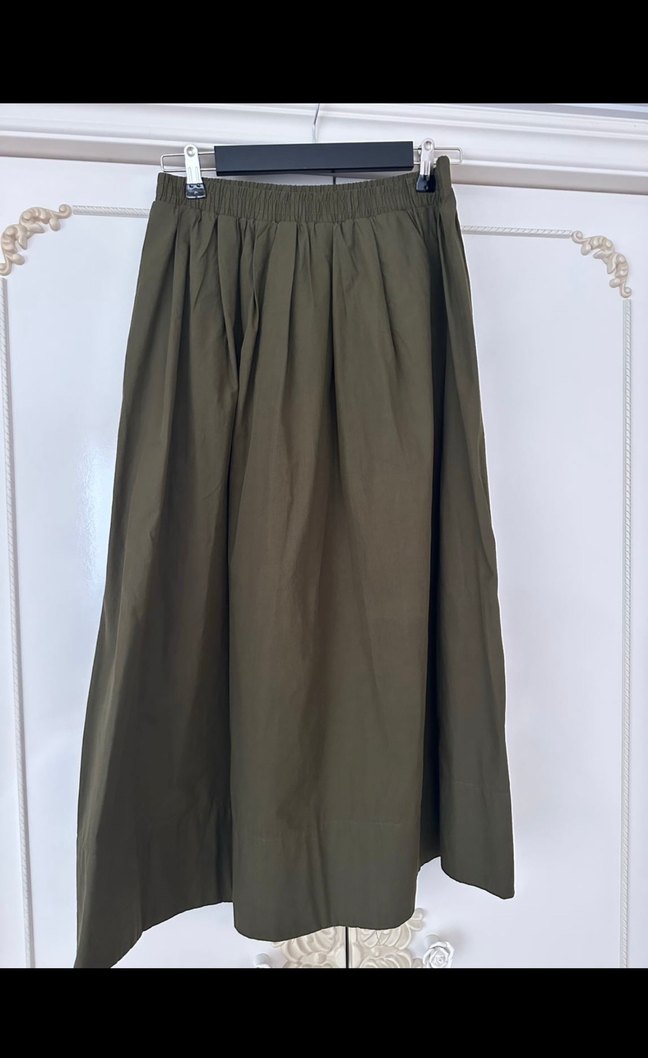 Kadın haki uzun pilili keten etek, bol kesim ve elastik bel bantlıdır. Minimalist, desensiz ve günlük kullanıma uygundur.