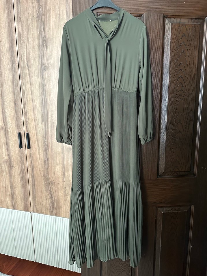 Kadınlar için uzun haki elbise, piliseli detaylara ve bol kesime sahiptir. Uzun kollu yumuşak sentetik kumaştan bohem tarzda üretilmiştir. Düğünlerde giyilebilir rahat şık bir elbisedir. Hiçbir sorunu yoktur 40-42 bedene uygundur beli lastiklidir