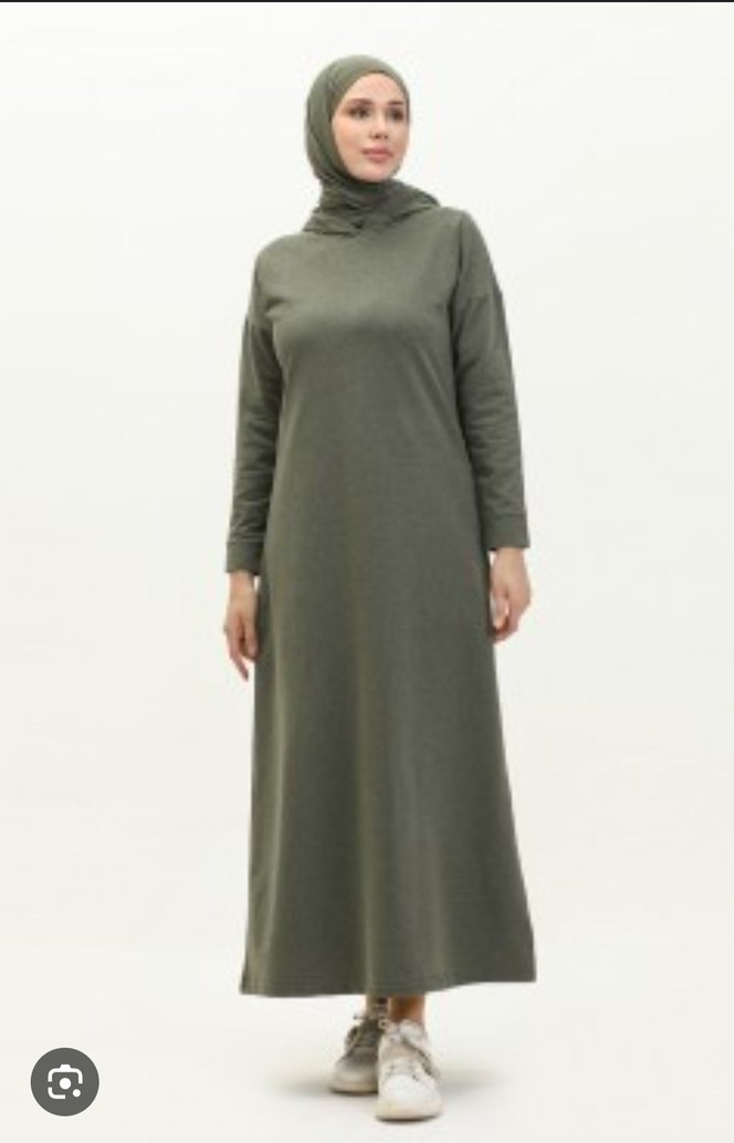 Kadın haki uzun elbise, yüksek yaka ve uzun kollu, salaş kesime sahiptir. Yumuşak sentetik kumaştan üretilmiş, günlük rahat ve sade bir tarza uygundur.