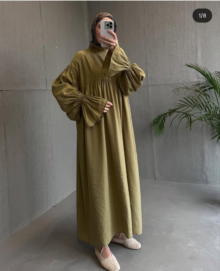 Kadın haki uzun elbise, salaş kesim, drapeli uzun kollu ve yüksek yakalı, yumuşak sentetik kumaştan, sade ve tesettür tarzında. Modal Kumaştır 140cm boyunda 48 bedene kadar uyumludur. 1 kez giyildi Yeniden farksiz