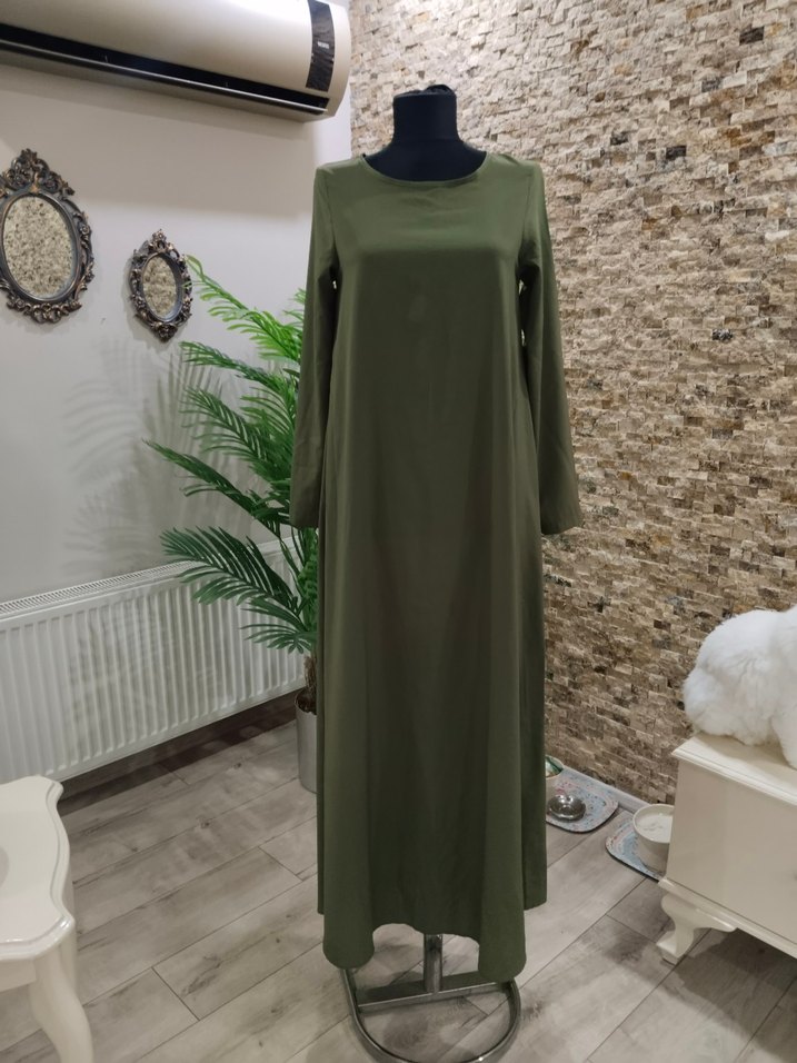 Kadınlar için haki renkte, uzun, salaş kesim ve drapeli tasarıma sahip elbise. Uzun kollu ve yuvarlak yakalı, ipeksi dokusuyla sade ve günlük kullanıma uygun.