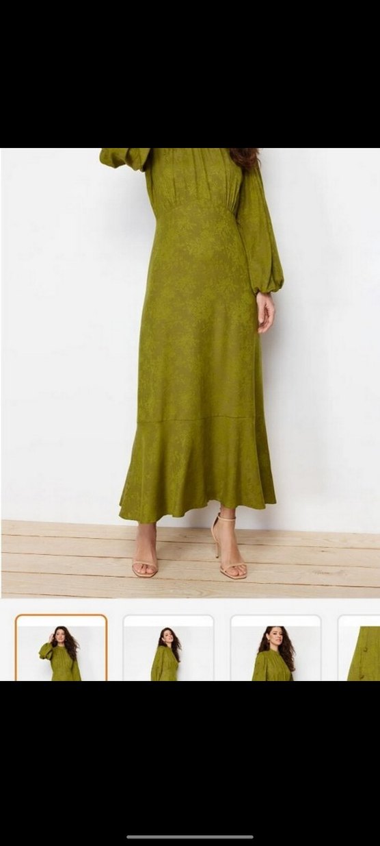 Haki renkte, uzun kollu ve yuvarlak yakalı, salaş kesim kadın elbisesi. Yumuşak dokuma elbise, drapeli ve hafif batik desenli, romantik buluşmalar için uygun.