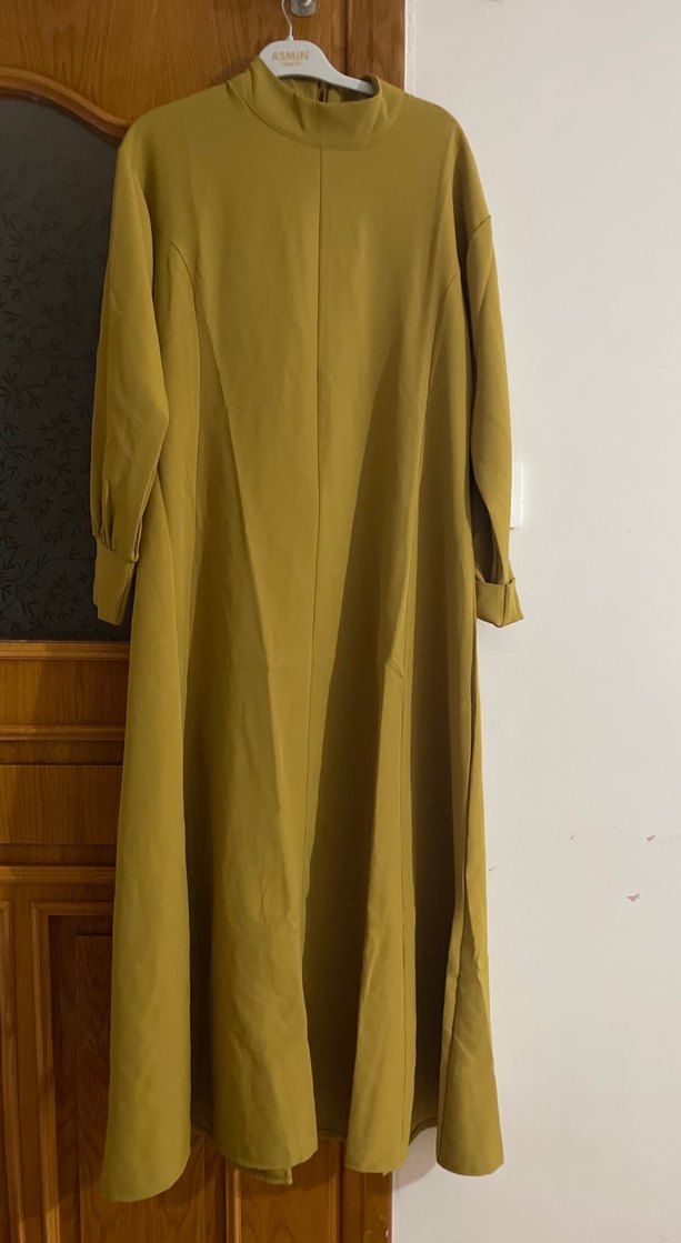 Kadın haki uzun elbise, salaş kesim ve drapeli detaylara sahiptir. Parlak sentetik kumaştan yapılmış, modest kesim yakası ve uzun kolludur. Minimalist normcore tarzıyla günlük kullanıma uygundur.