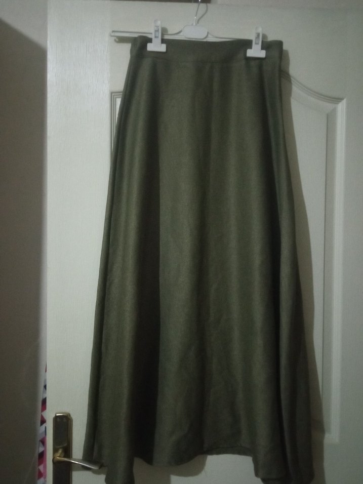 Kadın haki uzun etek, salaş kesimli ve dökümlü tasarıma sahip, sentetik kumaştan üretilmiştir, minimalist günlük kullanım için uygundur.