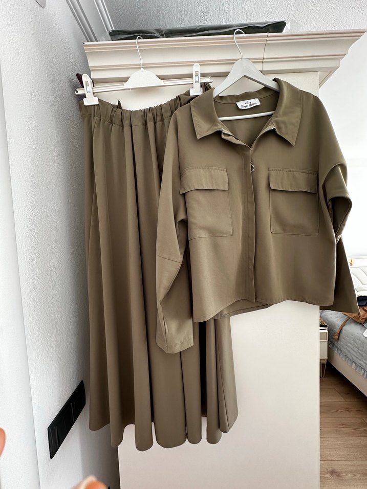 Kadın haki rengi uzun ve salaş kesim takım, pamuk kumaştan, uzun kollu ve yaka detaylı. Minimalist, zahmetsiz şıklık sunar.