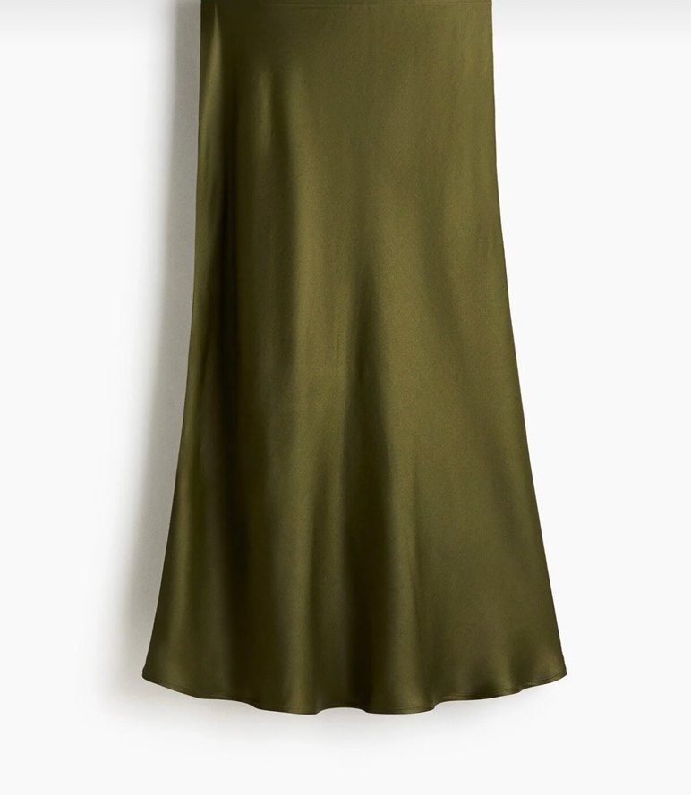 Kadın için parlak haki renkte, saten dokulu, dökümlü uzun etek. Minimalist ve günlük kullanıma uygun, rahat kesim.