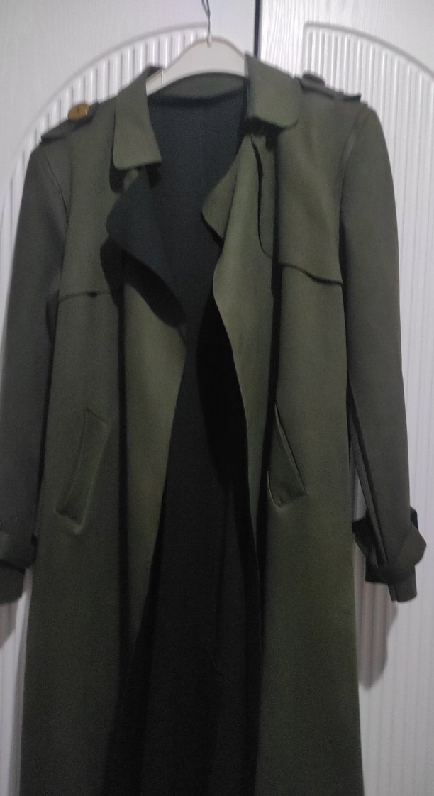 Kadın haki renk uzun süet trençkot, yakasında kesik yaka ve kemerli detay bulunur. Uzun kollu, regular fit, desen içermeyen bu trençkot, Paris sokak stilinden esinlenmiştir ve günlük kullanıma uygundur. boy 107 cm omuz 40cm