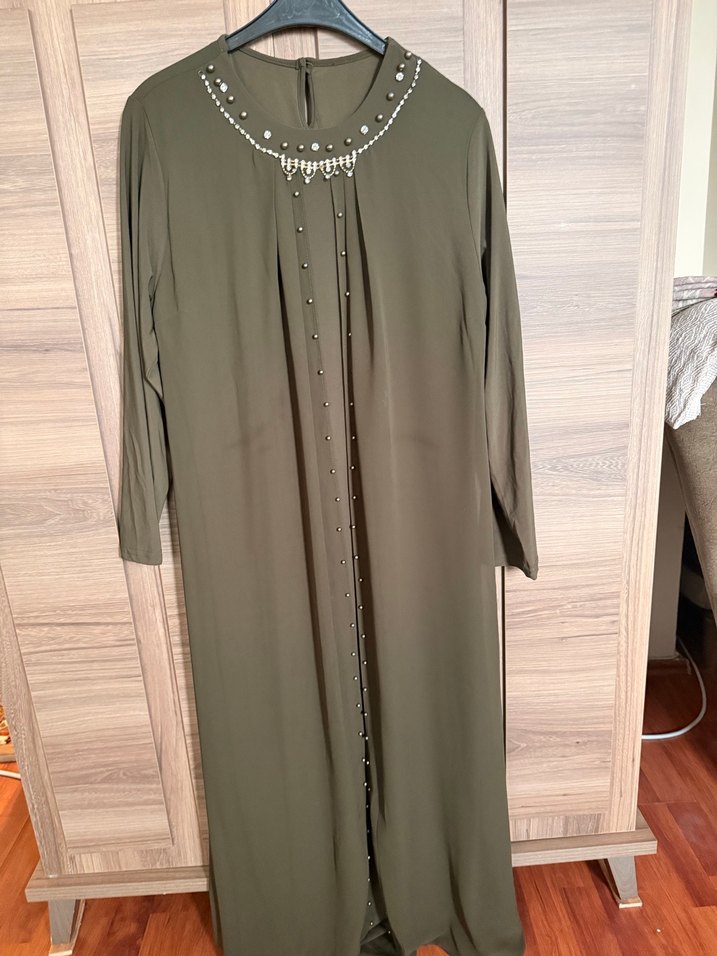 Kadın haki uzun elbise, salaş kesim ve drapeli detaylara sahiptir. Uzun kollu, özel günlerde bir kullanıma uygundur. deformesi yoktur 46/48 beden