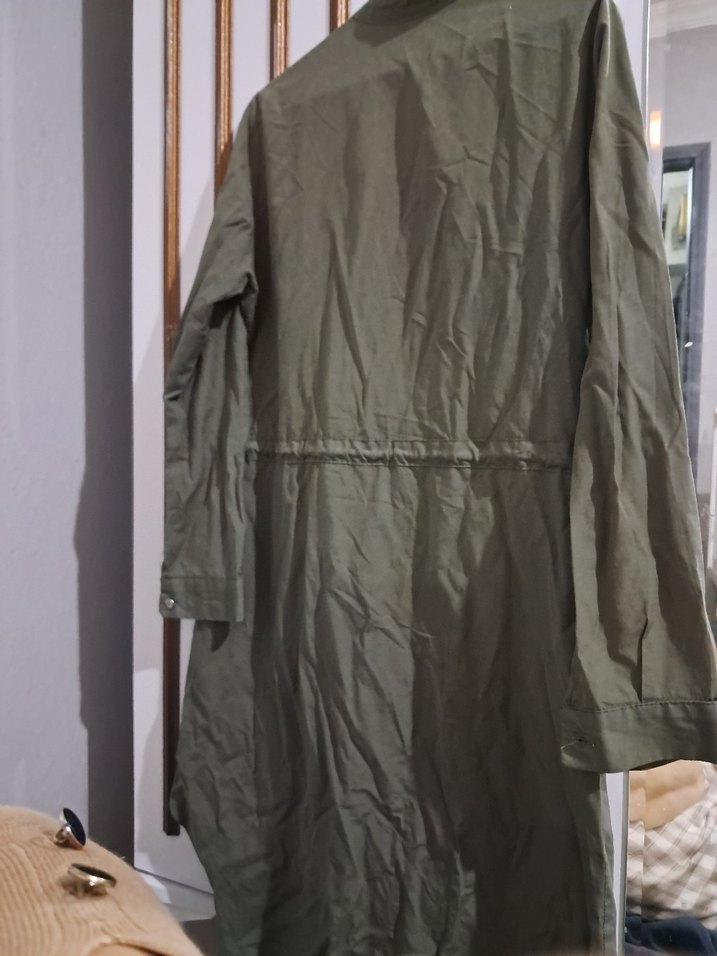 Kadınlar için kol kesim ve uzun kollu haki uzun tunik Düğmeli ve yakası kesik, minimal desensiz tasarım, günlük kullanım için uygundur. beli tünel kemerlidir marka temsilidir