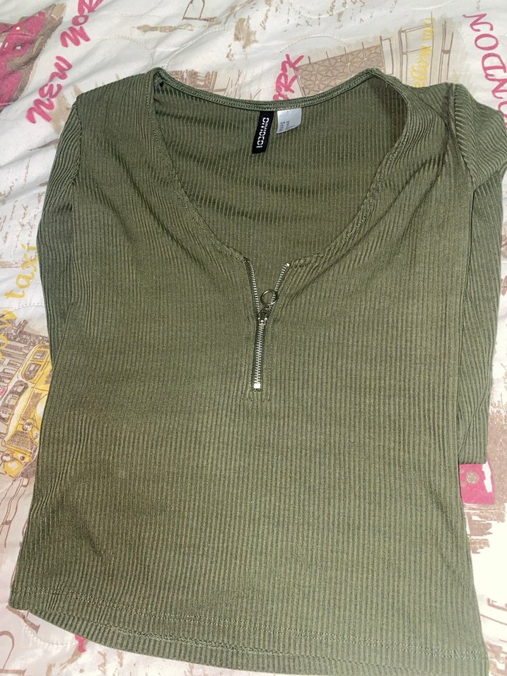 Haki renkte, fermuarlı V yaka ve uzun kollu, pamuk kumaştan yapılmış kadınlara özel fit bluz. Günlük kullanıma uygun, rahat sokak stili görünümü sunar.