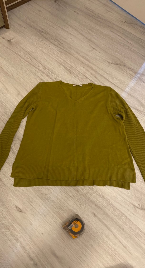 Kadınlar için haki renk, V yaka, uzun kollu, rahat kesim, örme keten kumaştan yapılmış, midi boy, desensiz triko kazak.