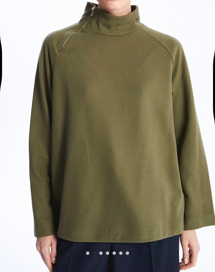 Kadınlar için yüksek yakalı, yarım fermuarlı, uzun kollu, bol kesim, yumuşak ve sıcak kumaştan yapılmış haki renk midi boy sweatshirt. Sadece bir kere giyildi tertemiz yeni gibi