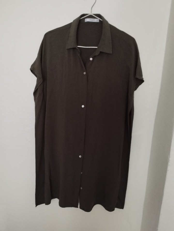 haki yeşil keten kumaştan, yakalı ve kısa kollu, günlük sokak stili için rahat kesim, minimalist ve zahmetsiz şıklık sunar.