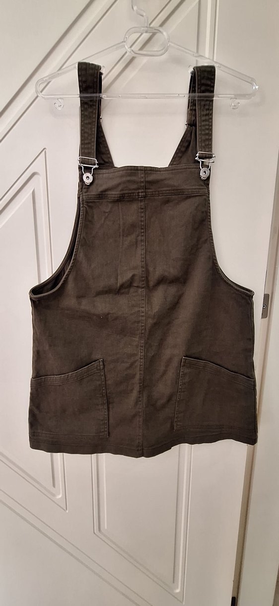 Haki Yesil denim kumaştan, askılı, bol kesim, tokalı kısa kadın salopet. Yüksek yakalı ve ön ceplidir. Günlük rahat kullanım için uygundur.