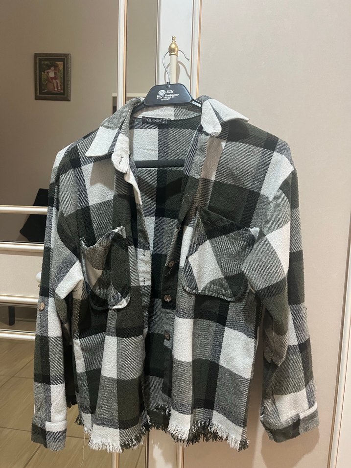 Pamuklu, gri ekose desenli kadın gömlek, düğmeli ve uzun kollu. Salaş kesim, notched yaka ve midi boyda, günlük kullanıma uygun.