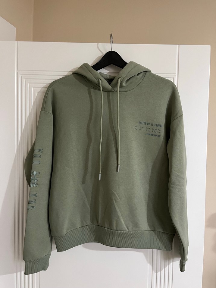 Yumuşak ve sıcak kumaştan, baskılı detaylara sahip, bol kesim haki yeşili kapüşonlu sweatshirt.