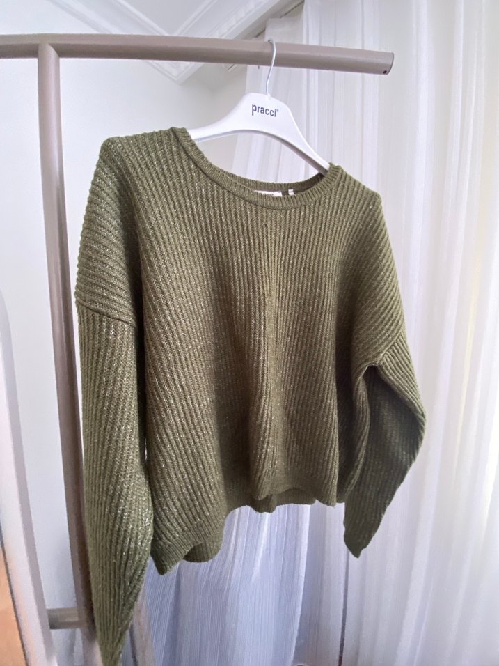 Hali yeşili örgü, yuvarlak yaka ve uzun kollu, salaş kesim kazak. Rahat ve sade tasarımıyla günlük sokak stiline uygundur.