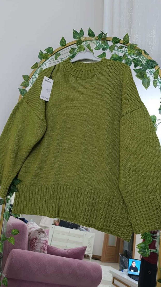 Bu yumoş haki triko kazak, salaş kesimi, uzun kolları ve yuvarlak yakası ile dikkat çeker. Normal midi uzunlukta, rahat ve günlük kullanıma uygun tarzda bir üründür.