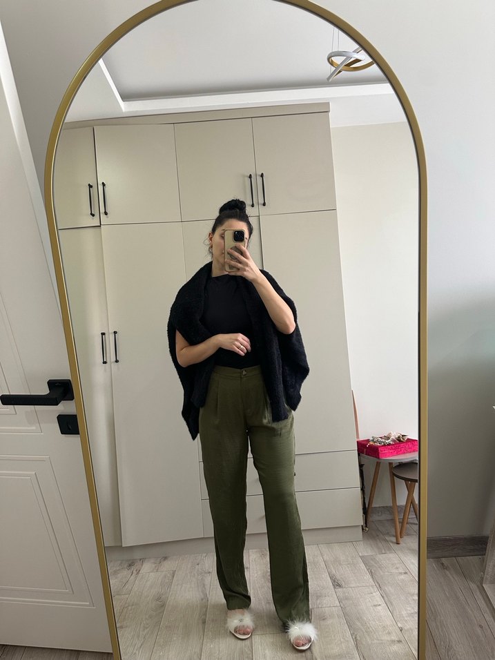 Yün kumaştan, haki renkte, bol kesim ve midi boy kadın pantolon. Desensiz ve rahat tarzıyla günlük kullanıma uygundur.