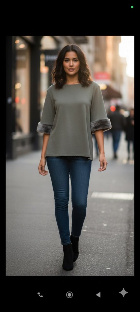 Kadın hakibyesil Denim Tunik, Kürklü Kısa Kollu