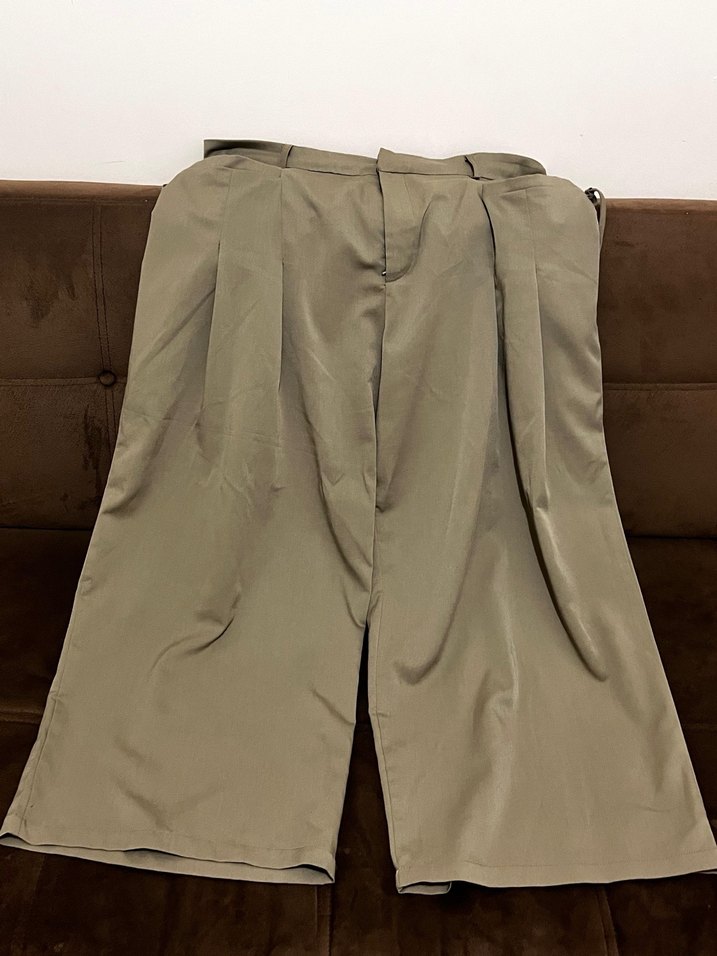 Haki renkli, pilili ve bol kesim midi kumaş pantolon. Yumuşak ve satenimsi dokuda, sade ve minimalist tarzda günlük kullanım için uygun.