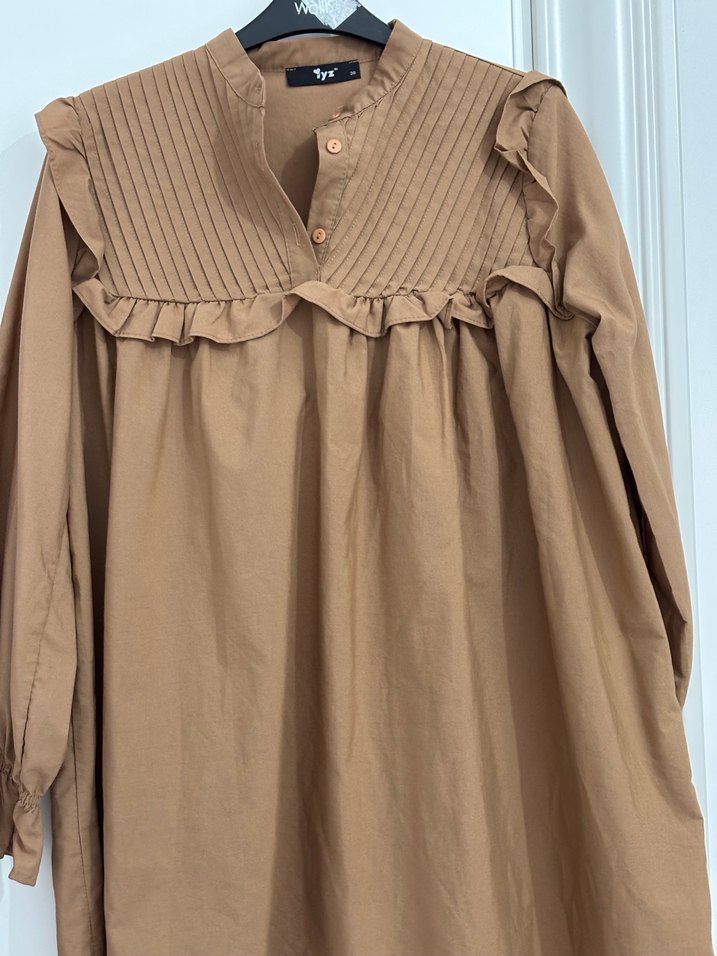 Kadınlar için keten kumaştan, bol kesim, uzun kollu, V yakalı, fırfırlı ve pileli ön detaylı hardal uzun tunik. Bohem tarzına uygun.
