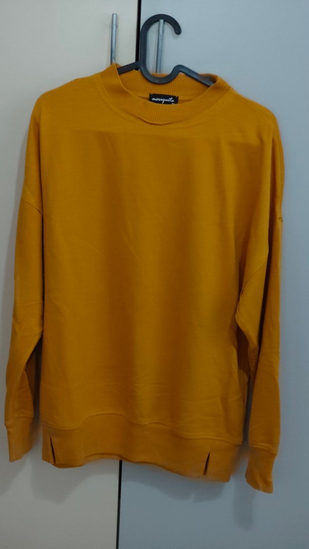 Kadın uzun kollu, yuvarlak yakalı, salaş kesim hardal sweatshirt. XS yazıyoruz ama M beden gibi ölçü verilir