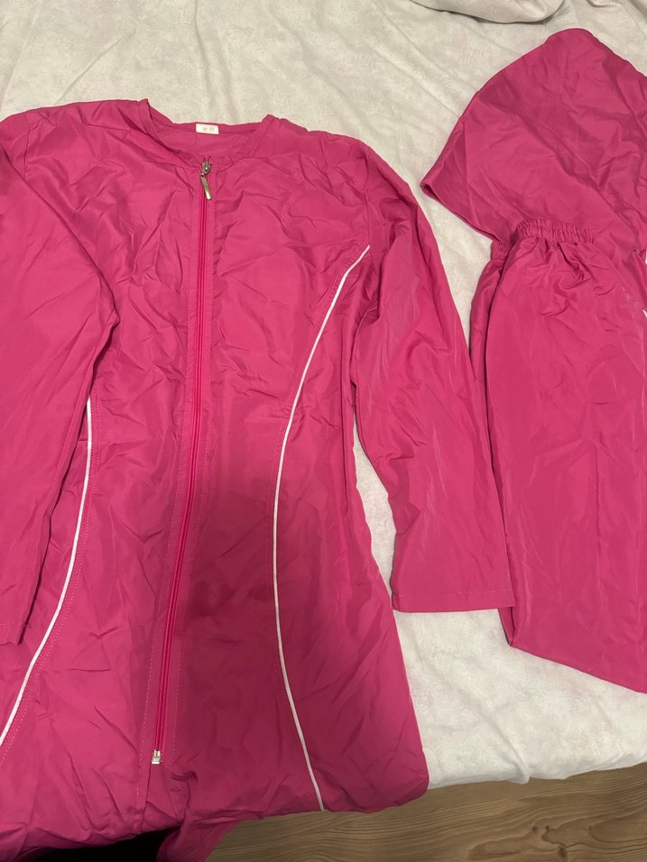 Fermuarlı ve uzun kollu, parlak pembe renkli, yüksek yakalı, uzun boy haşama bi kez kullanıldı