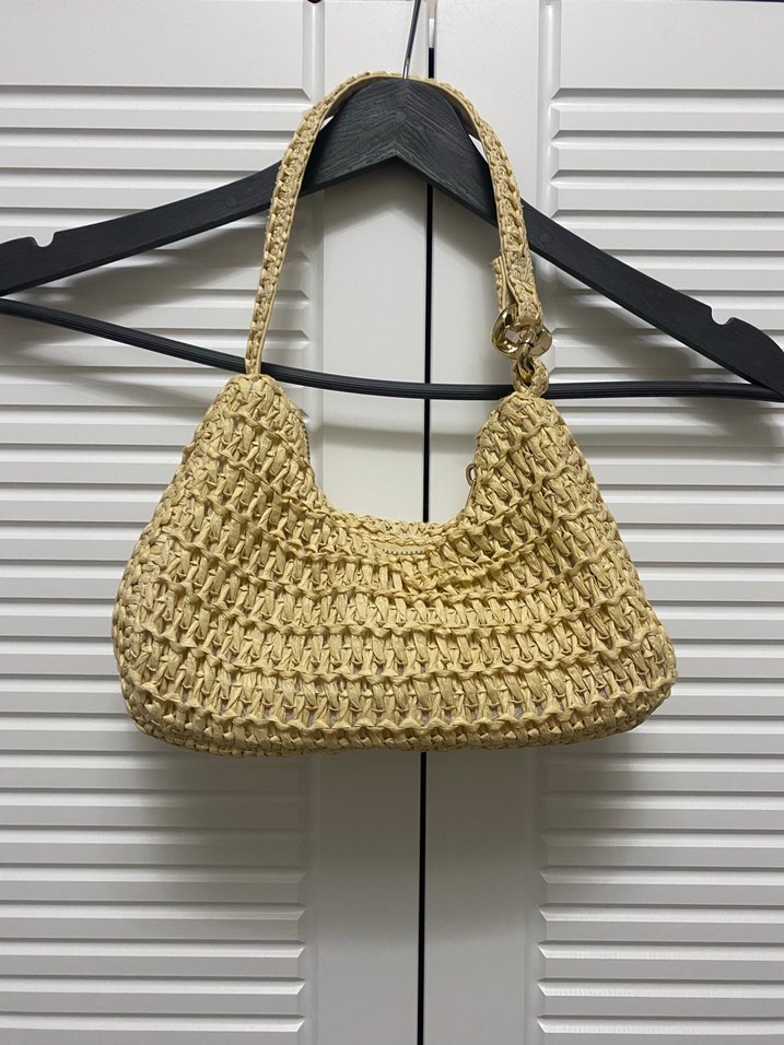 Bej renkli, minimalist ve bohem tarzda örgü desenli hasır kadın çantası. Günlük kullanıma uygun, hafif ve desensiz dokuma yapıda.