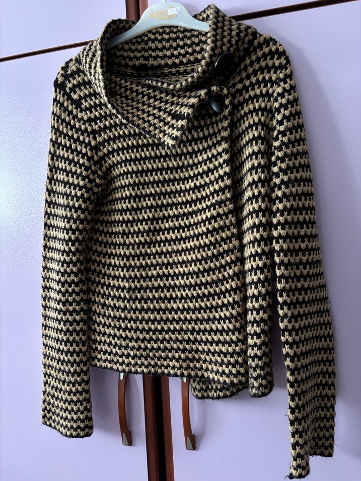 klasik yaka ve uzun kollu olup yumuşak yünden yapılmıştır. Normal kesim ve midi boydadır. Hiçbir kusuru yoktur S-M beden uyumludur